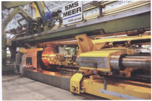 我國鈦及鈦合金擠壓生產開始于20世紀60年代末。當時,寶鈦公司和長城鋼廠分別從德國引進了一臺3150噸可擠壓鈦合金的熱擠壓機。經過近40年發展,寶鈦公司可擠壓鈦及鈦合金的各種規格的管、棒材及簡單斷面的型材及復合材,牌號達幾十種。這些產品已廣泛應用于航空、航天、衛星以及能源、化工等國民經濟的各個部門。但是還應該看到,我國與先進國家相比,還存在較大差距,較復雜斷面的型材還不能生產。近幾年,隨著化工等民用領域對高質量鈦管需求劇增,西部鈦業、浙江五環等公司先后引進了主要用于擠壓鈦管的擠壓機。2009年10月,寶鋼特鋼從德國引進的世界先進水平的6000T擠壓機投產(如圖3),為我國生產大規格鈦管和型材提供了必需的裝備,標志著我國鈦材擠壓設備上了一個新臺階。