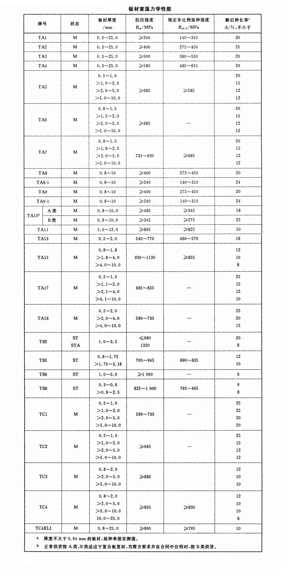 鈦合金板類型的鈦具有密度小、耐高溫、耐腐蝕等特性。鈦合金強(qiáng)度高,大量用于制造軍用超音速飛機(jī)的結(jié)構(gòu)部件,也用于制造火箭發(fā)動(dòng)機(jī)殼體、人造衛(wèi)星殼體等,還可用于制造船舶及潛艇的各種部件。用鈦合金制造火炮、坦克等,既能減輕重量,又很耐用。通常使用抗拉強(qiáng)度表示鈦材的室溫性能,GB/T3621一2007標(biāo)準(zhǔn)中對(duì)鈦合金板材橫向室溫力學(xué)性能規(guī)定如下: