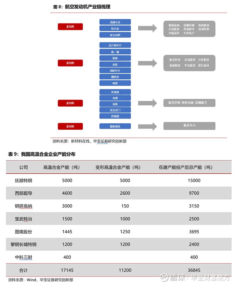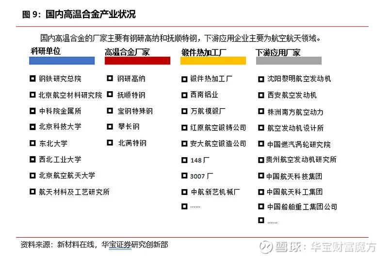 經過50多年發展,我國已經形成了比較先進,具有一定規模的生產基地。結合產業鏈各個環節相關參與方來看,目前我國生產廠商集中在航空航天領域用量最大的變形高溫合金冶煉和鍛造環節,因此在大批量生產高溫合金母合金、板、棒、鍛材上有很大的優勢。