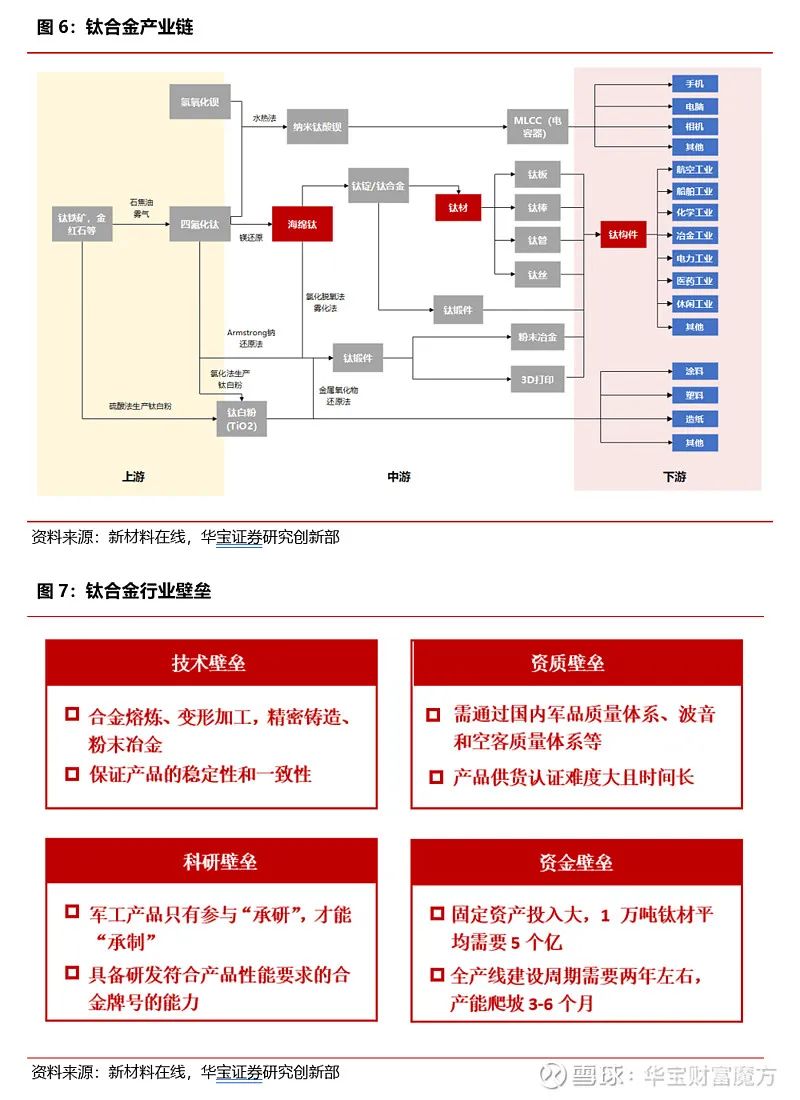 鈦合金的制備工藝較高溫合金簡單,難點集中在海綿鈦和鈦材的制備。鈦材產業鏈的核心壁壘不在于上游資源和中游冶煉,而是在于鈦材的加工能力,尤其是高端鈦材的研發能力和制造工藝。鈦合金加工壁壘高筑,導致綜合壁壘亦較高,催生近乎雙寡頭競爭格局。盡管原料金屬鈦價遠低于鎳,但是基于鈦合金后端加工工藝復雜,最終部分鈦合金產品價格與高溫合金價格相當,甚至略高一籌。